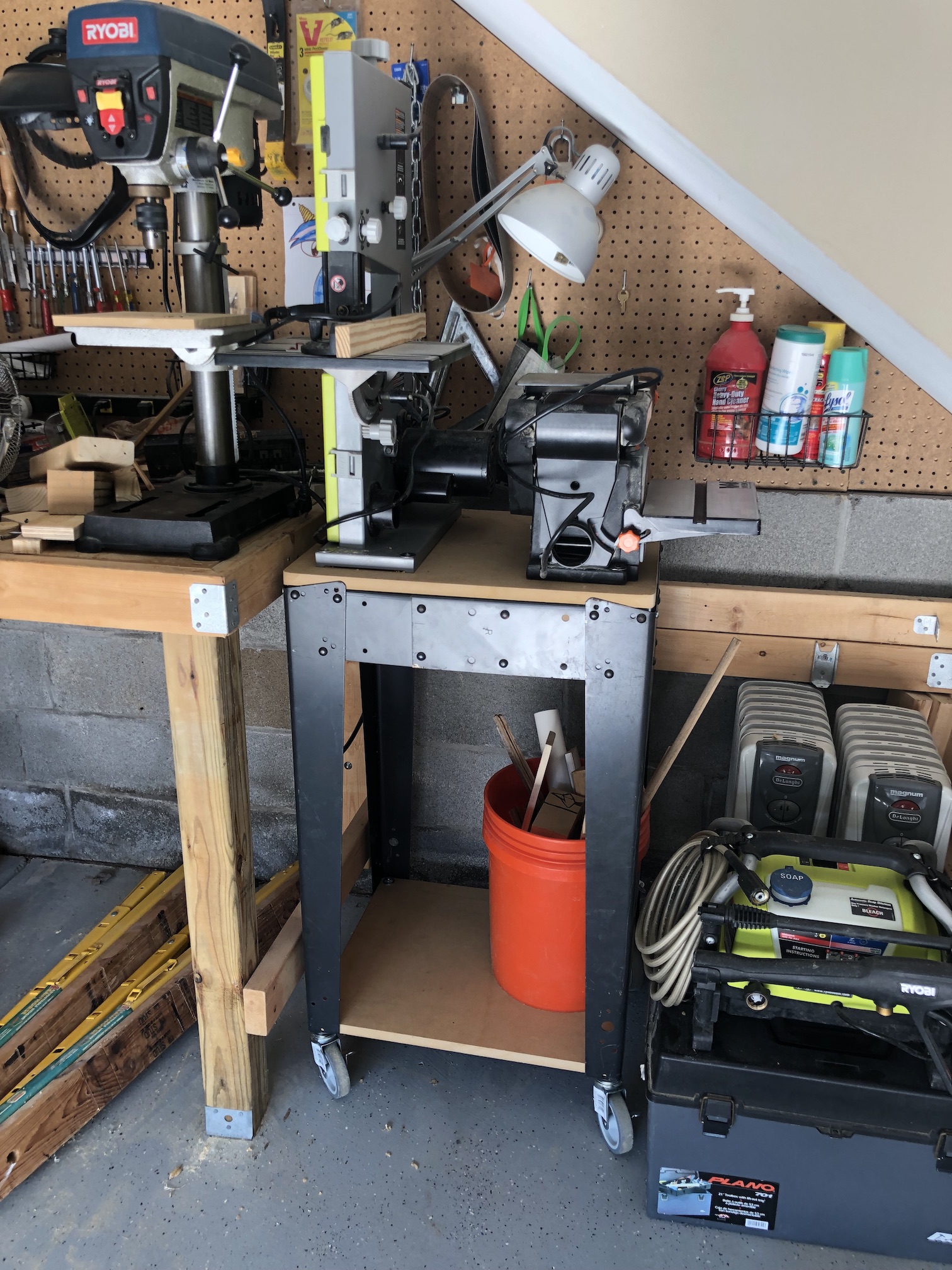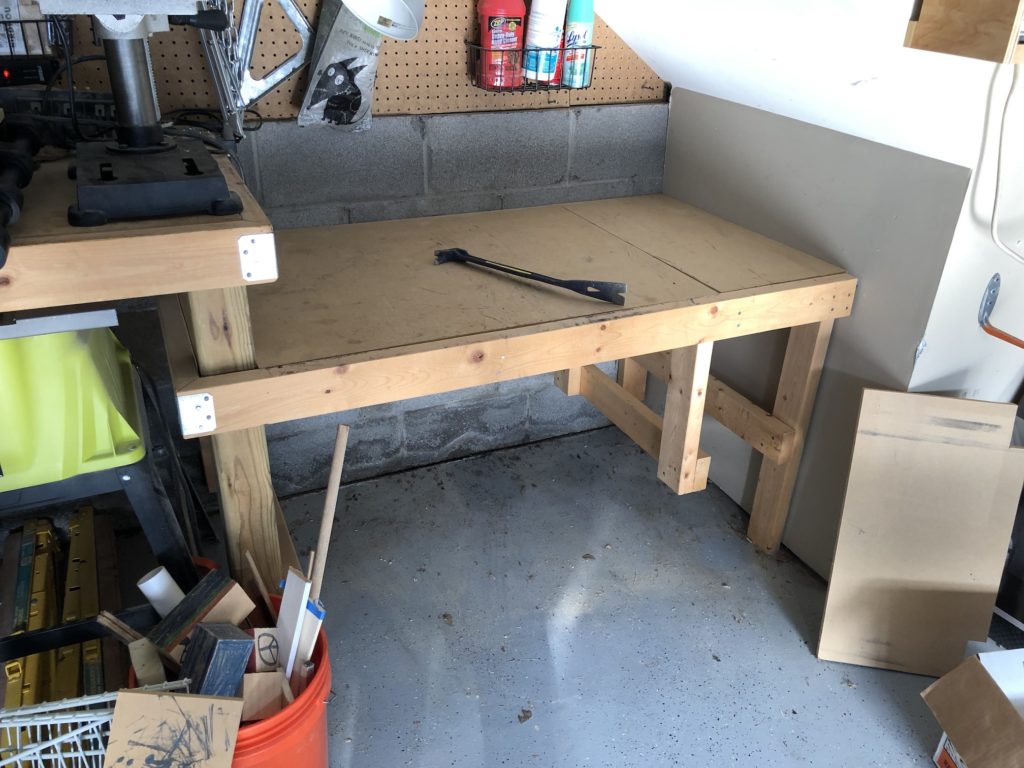 Ten years ago — not long after we moved into this house — my younger brother and I built a pair of workbenches. I designed a “tall” work bench for standing and a “short” work bench that I could sit at (aka, a desk). The idea was that I’d do electronics or other work at the desk. However, “near woodworking tools” is a pretty lousy place to do soldering , etc. and this ended up just being a place to pile scraps and store my drill press, band saw, and power sander. Unfortunately, to use any of those then, I had to haul it out of the corner and put it on another space. They’re not terribly heavy but none of this was ideal. So I had decided I’d tear out the “low” bench and put rolling tool stands in that space. If I’m going to move these tools out to use them, it should at least be easier to do!