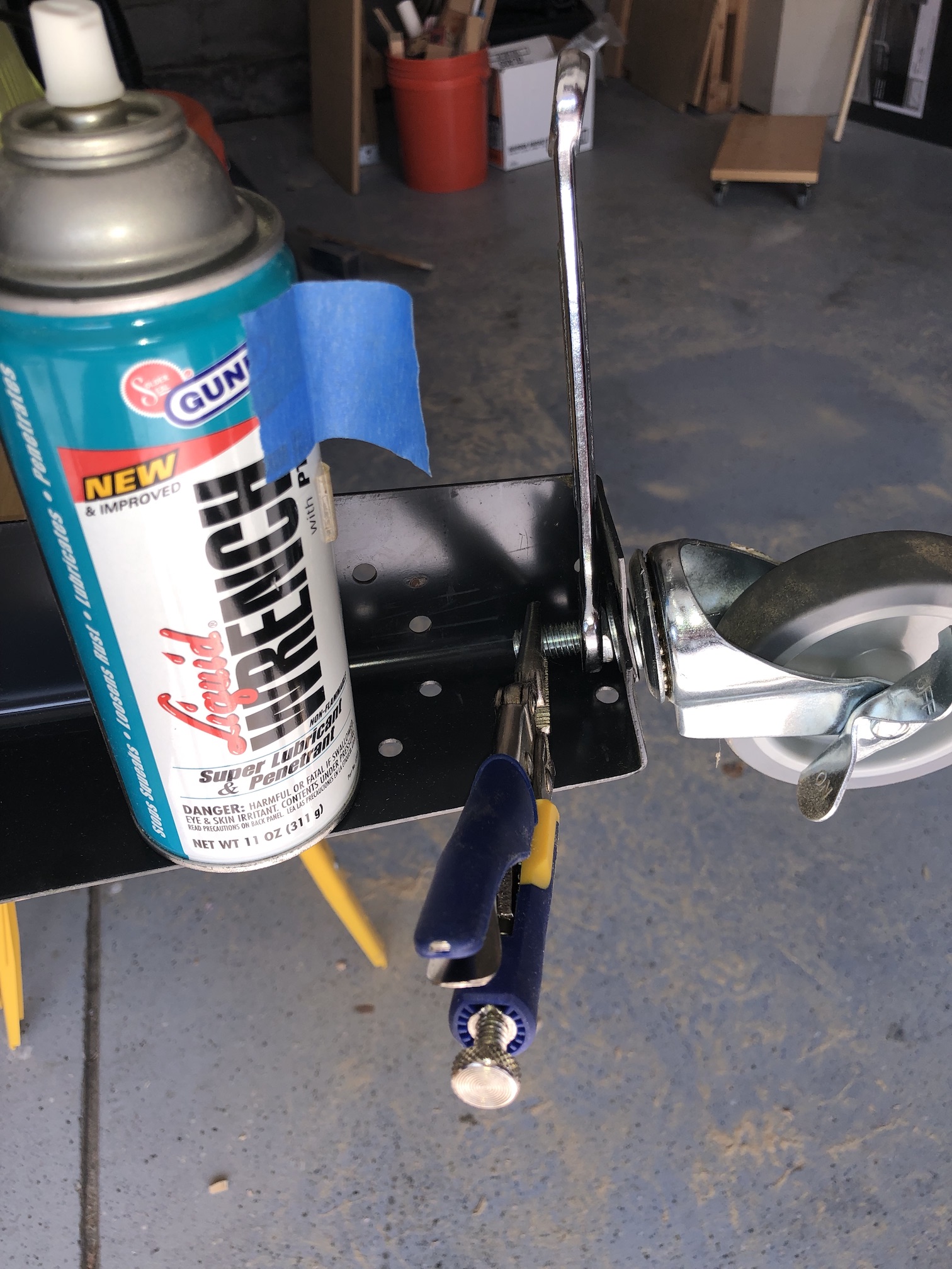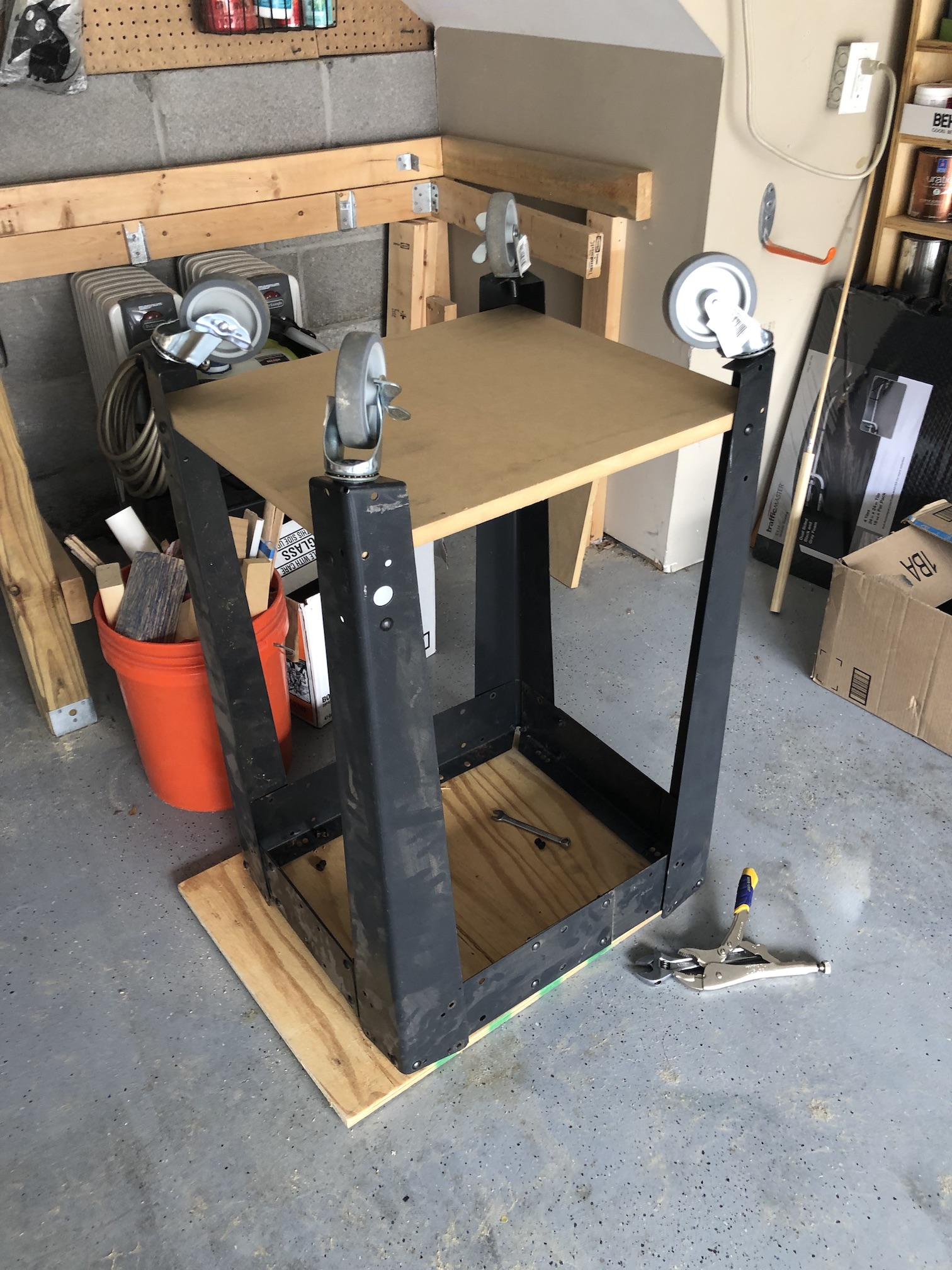 The casters are the threaded bolt post type. If you’ve never seen these before, please know that they are the worst. The end of the threaded rod is some weird star thing (no, not a Torx bit) which you cannot hold and just spins with the bolt. So, there’s no real good way to loosen a stuck nut — of which I had two. My design required that these casters come off so that I could use them to also mount the bottom shelf. So, some Liquid Wrench and some vice grips to hold the threaded rod (which messes up the threads some, but wasn’t important as that’s where the shelf now sits), I prevailed.