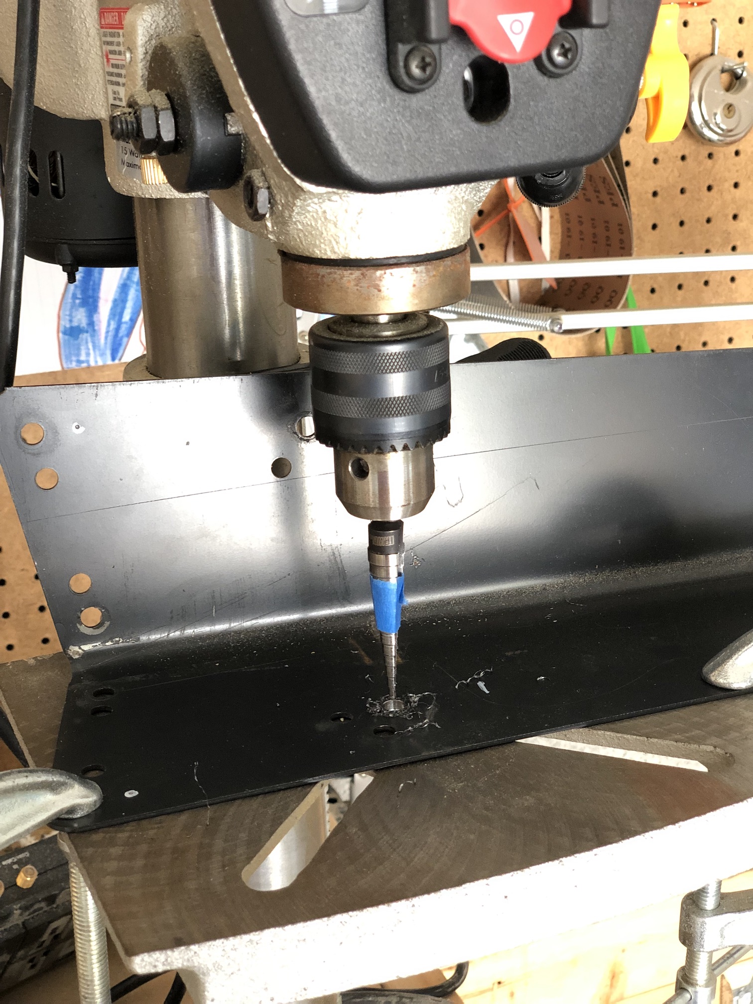 I used the drill press and my step bit to drill the holes. Drilling steel is significantly more difficult than drilling aluminum (which can be generally cut with woodworking blades or bits). I recently read Adam Savage’s book “Every Tool’s a Hammer” in which he has a chapter titled “Use More Cooling Fluid” and, man, is that every sound advice for cutting steel. I typically call it cutting fluid, but given the amount of smoke I was generating, it was definitely getting hot. Also, unlike aluminum, steel is going to have burs that need to be filed off, even when cutting with a step bit. So I had to clean up each of the sixteen holes drilled.