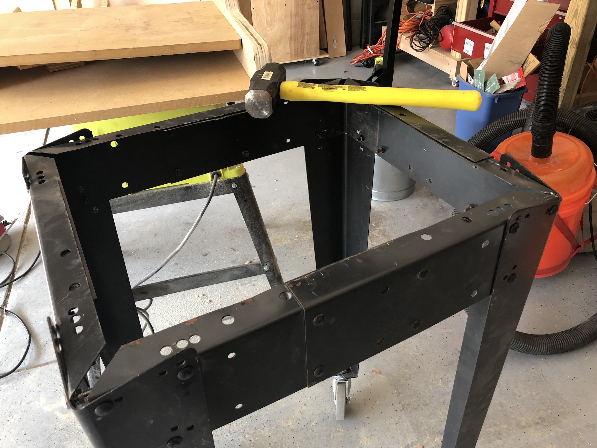 I got the legs re-assembled and cut a top surface (also cut from the old bench’s MDF surface). I did have to replace a few of the bolts with spoiled threads but I happened to have some spare 1/4″ bolts & nuts. It was at that point that I realized that the surfaces of bent steel that were formerly parallel to the floor were now about 10° out of flat. Enter the 5 lbs sledge. I basically whacked the hell out of the top lip all around until the to surface lay nearly flat. Using some screws through the mount holes then got it nice and level.